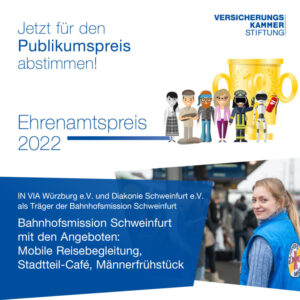Die Bahnhofsmission Schweinfurt (Träger: IN VIA Würzburg e.V. und Diakonie Schweinfurt e.V.) ist für den Ehrenamtspreis 2022 der Versicherungskammer Stiftung nominiert.